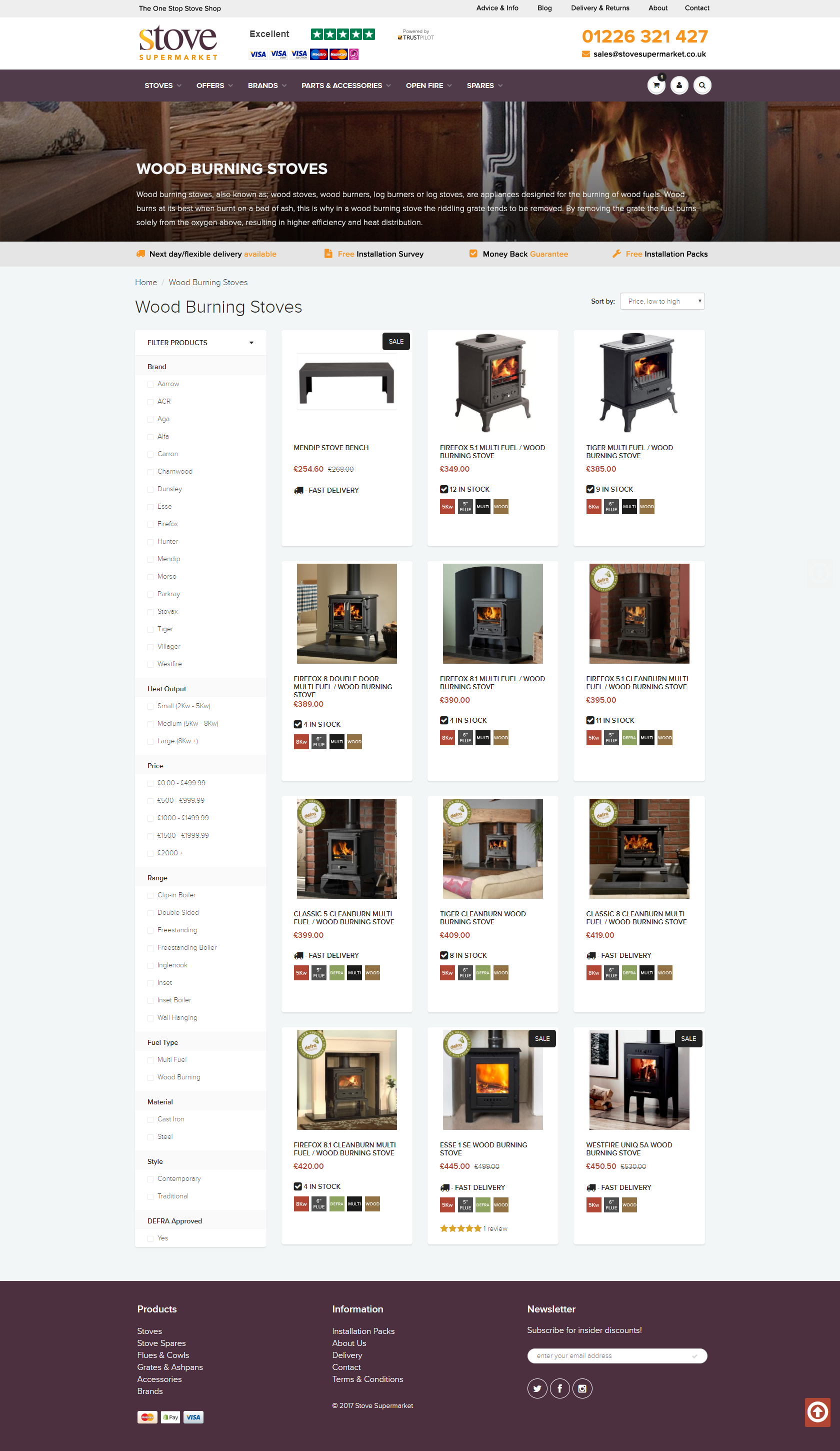 Based on how the product range was categorised, we added a bespoke quick-find block to help customers find a stove in their preferred style, fuel type and energy output which navigated them to the product list page with filters applied - meaning they were browsing relevant products in a flash.